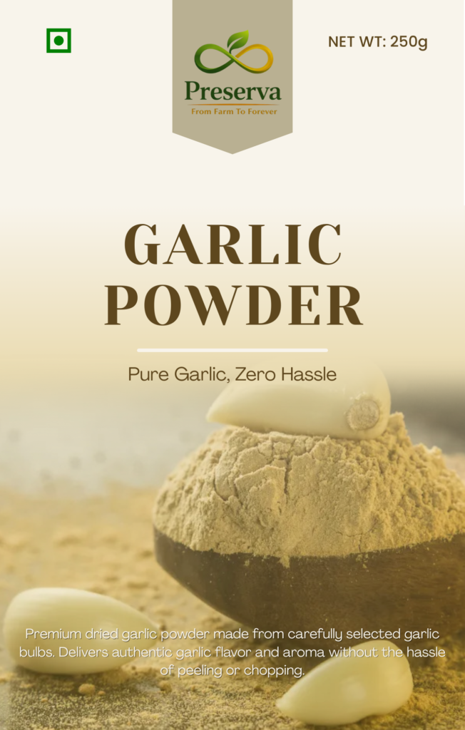 Premium dried garlic powder made from carefully selected garlic bulbs. Delivers authentic garlic flavor and aroma without the